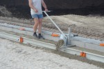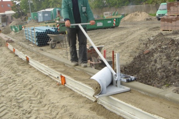 Für das Rinnsteinfundament (Fahrbahnseite) wird nach dem Einbau des Planums erneut die Schalung mit wenigen Handgriffen eingerichtet, Beton eingefüllt und mit dem Optimas-Betonhobel zeitsparend abgezogen. Der Betonhobel läuft auf höhenverstellbaren Rollen auf der Bordsteinoberkante und stützt sich auf der anderen Seite auf der Schalung ab.
