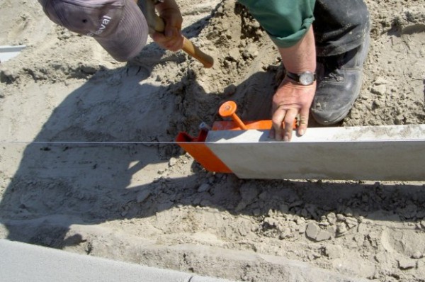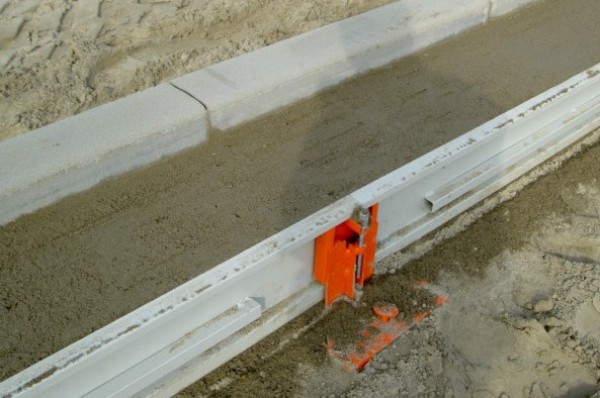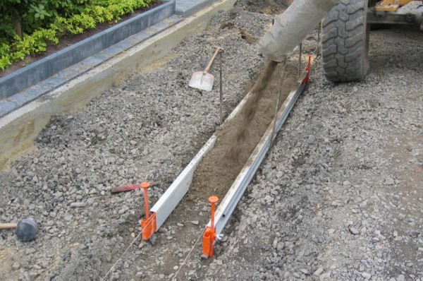 Erstellen von Bordsteinfundamenten. Mit dem Schalungssystem ist dieser Arbeitsgang kostensparend und vor allem qualitativ hochwertig zu erledigen. Nach dem Einmessen der Schnurhöhe auf der Frostschutzschicht wird das in unterschiedlichen Längen von 0,50 / 1,25 und 3,00 m lieferbare Aluminium-Schalungsprofil auf beiden Seiten mit Schalungsprofilträgern in wenigen Minuten aufgebaut. Das Einnivellieren erfolgt millimetergenau durch die höhenverstellbaren Träger. Im Anschluss daran wird der Beton eingefüllt.